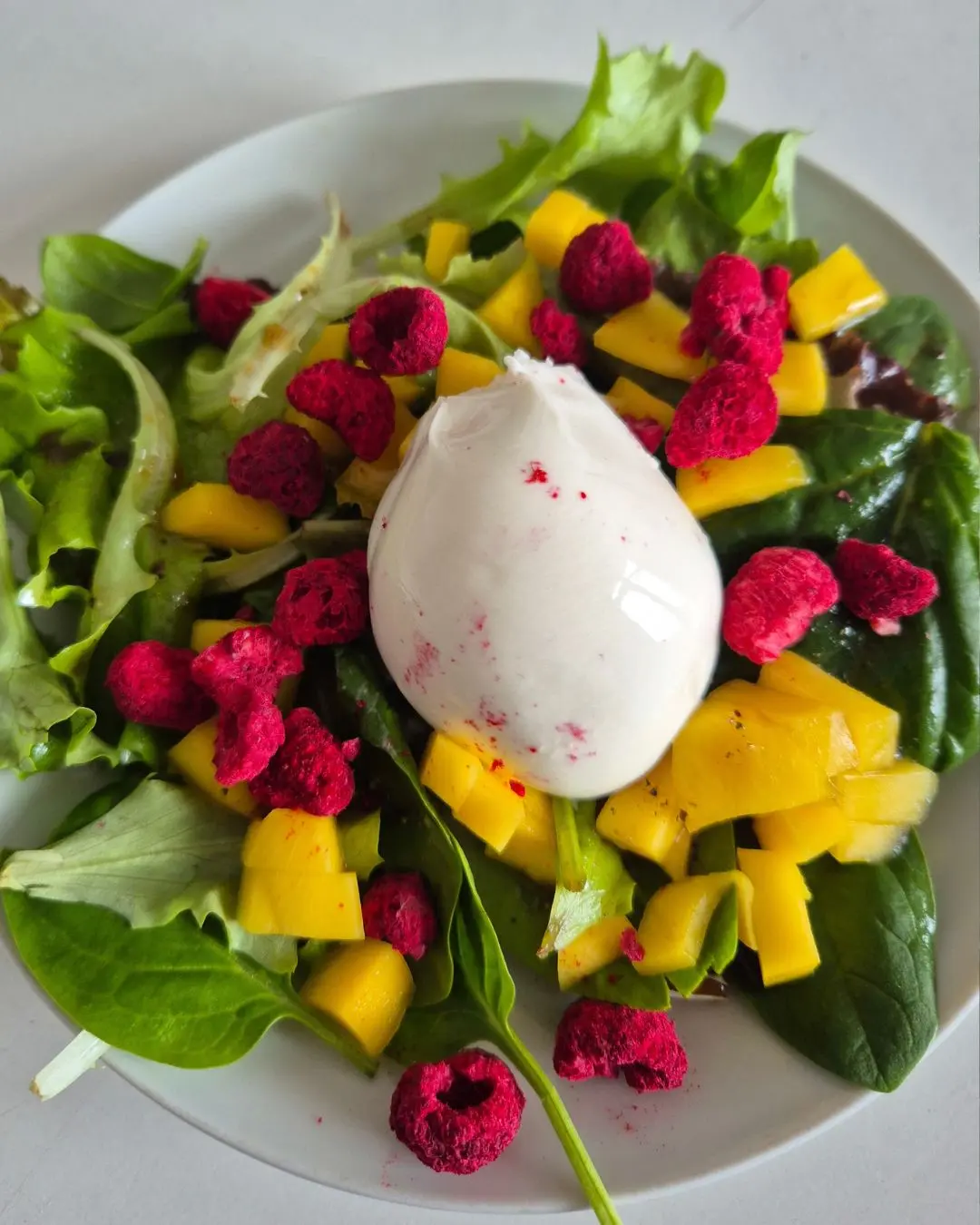 Burrata auf gemischtem Salat mit Mango und gefriergetrockneten Himbeeren